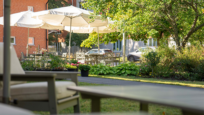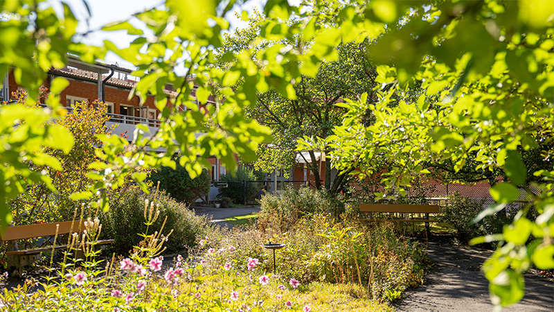 Vår trädgård är en naturlig mötesplats som motverkar ofrivillig ensamhet. Här finns anpassade gångstråk för träning, fruktträd, bärbuskar och örter. Här kan våra boende med personal, anhöriga eller på egen hand njuta av naturens skönhet, fika, känna doften av blommor, höra fågelsång och smaka på färska bär.