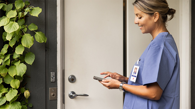 Ett digitalt lås öppnar du som arbetar i hemtjänsten med en digital nyckel i din jobbmobil. Låset gör att du inte längre behöver administrera fysiska nycklar.